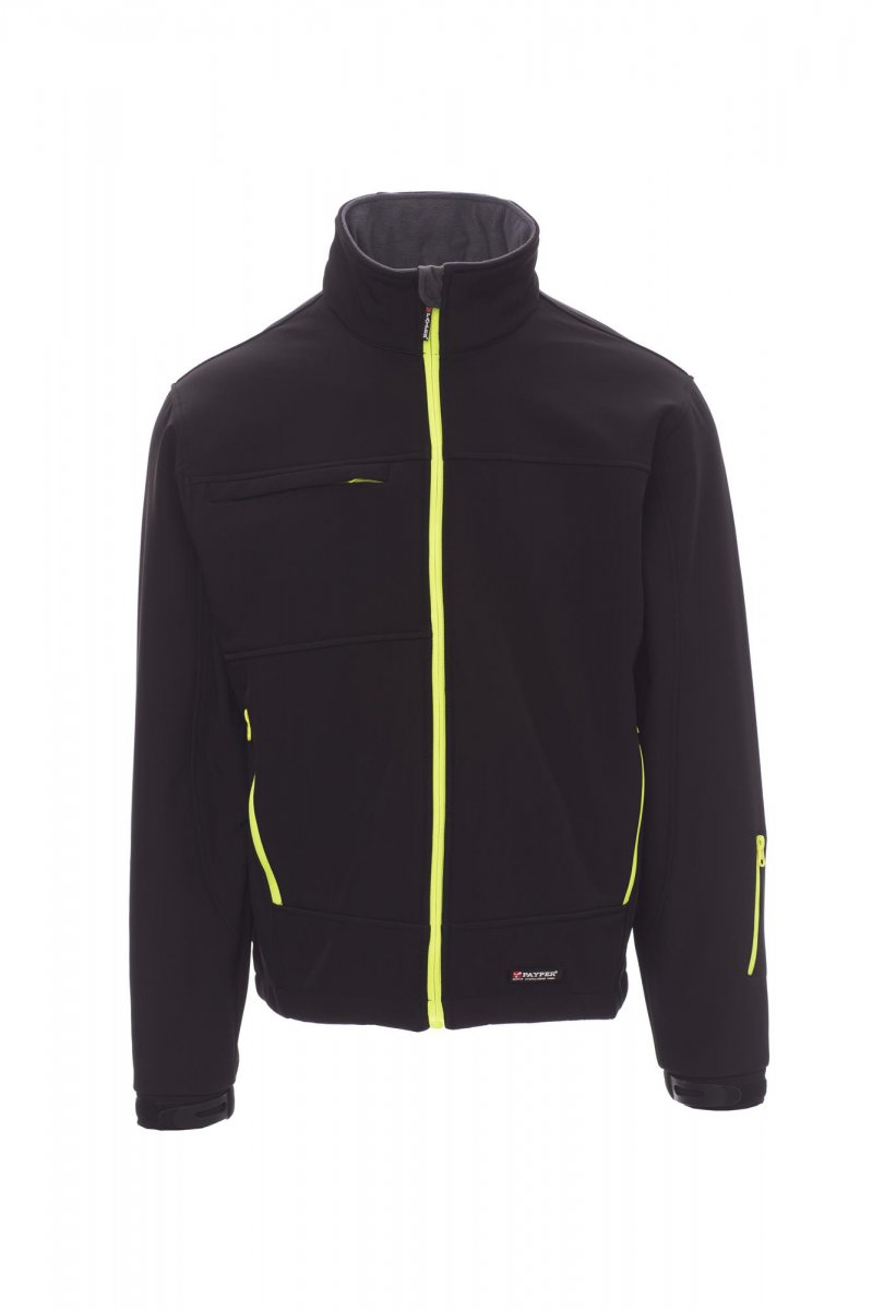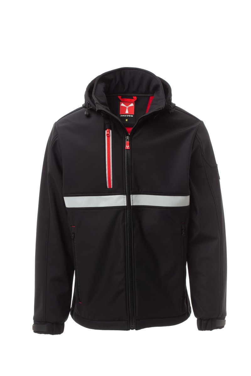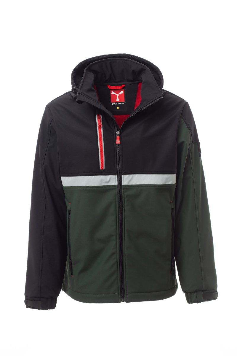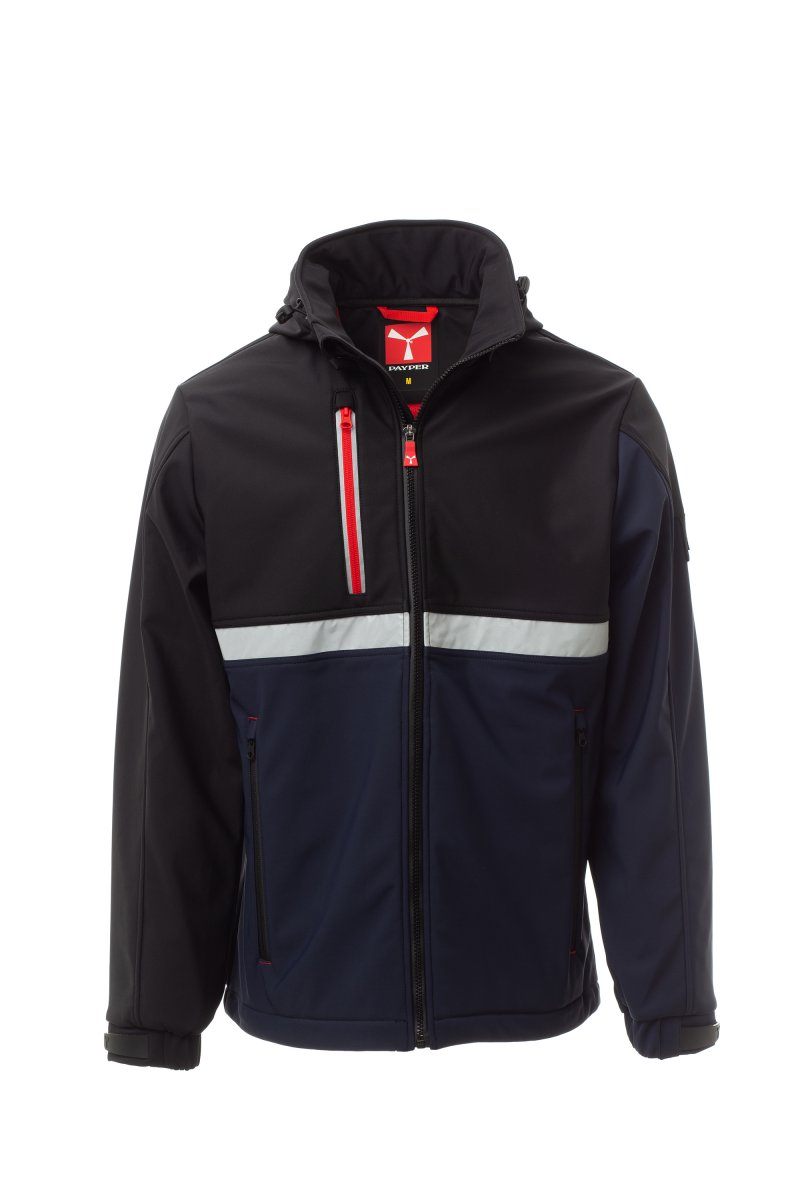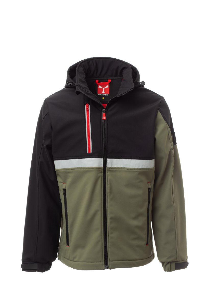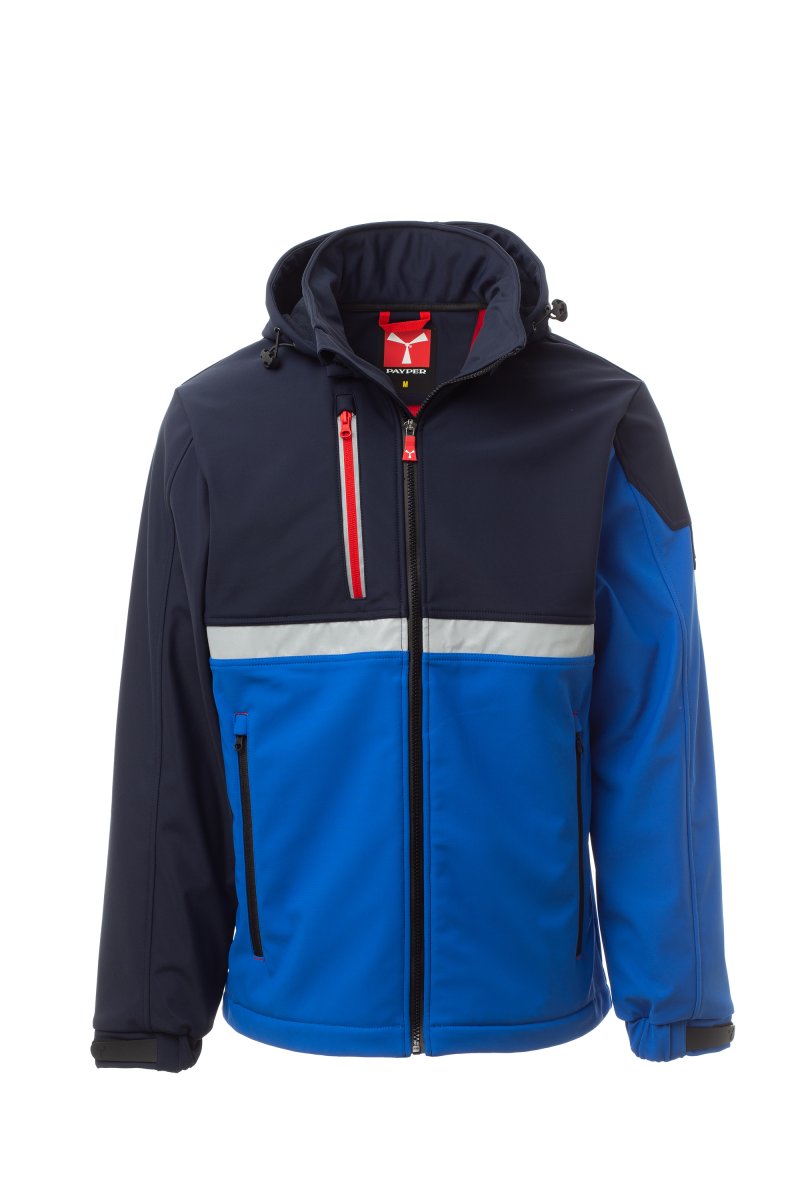 Soft-shell 3 couches, manches montées, fermeture par zip SBS en plastique avec curseur en métal à verrouillage semi-automatique. Capuche amovible et coulisse réglable avec stoppeur. Épaules avec tissu en contraste et bandes rétroréfléchissantes. Deux poches latérales avec zip, une poche poitrine multifonction avec porte-badge escamotable et rabat de fermeture LOCK SYSTEM. Poignets élastiqués, réglables par fermeture autoagrippante. Passepoil rétroréfléchissant sur le bas arrière.