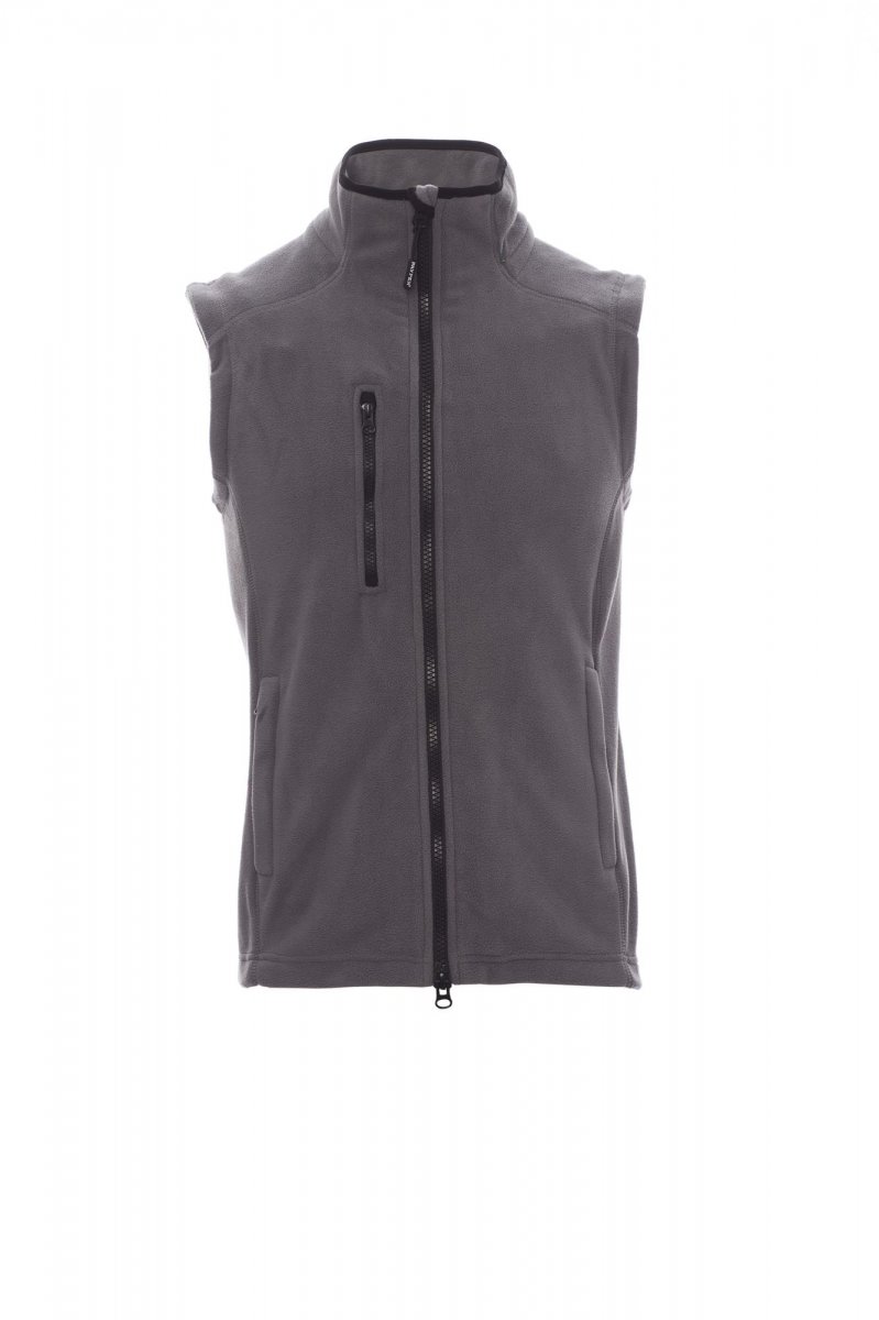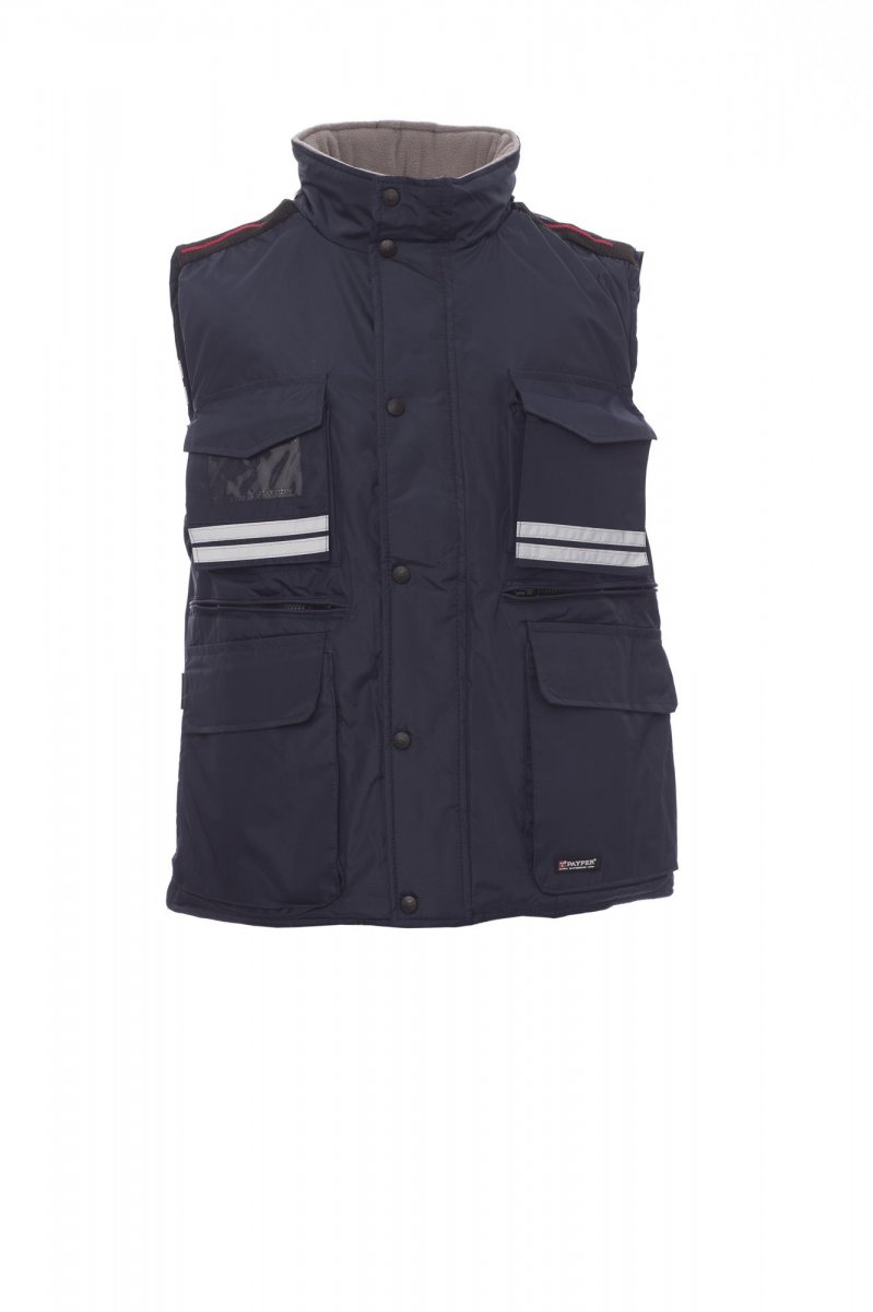 Gilet homme, à zip de 8 mm en plastique avec curseur en métal, rabat et boutons en plastique, capuche profilée détachable et/ou repliable dans le col, passepoils réfléchissants gris devant et derrière, fente latérale à soufflet et zip, neuf poches extérieures dont deux LOCK SYSTEM, deux zippées et intérieur renforcé, une avec porte-badge réversible. Intérieur : rembourré, col, dos et chauffe-reins en micropolaire, coulisse à la taille et fermeture éclair intérieure pour faciliter impressions et broderies.
